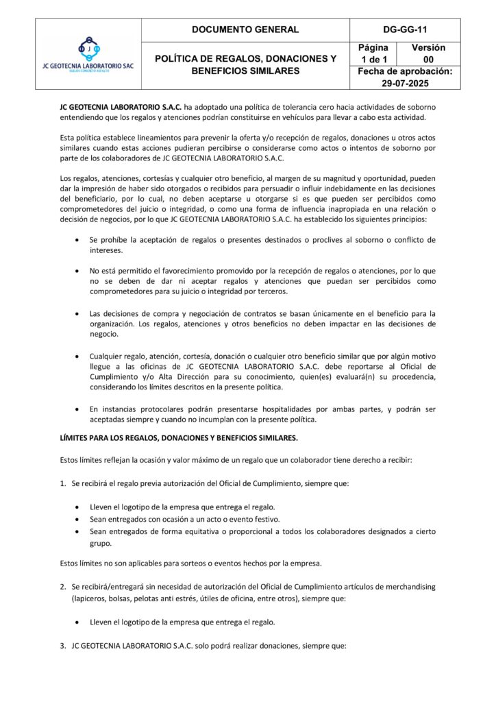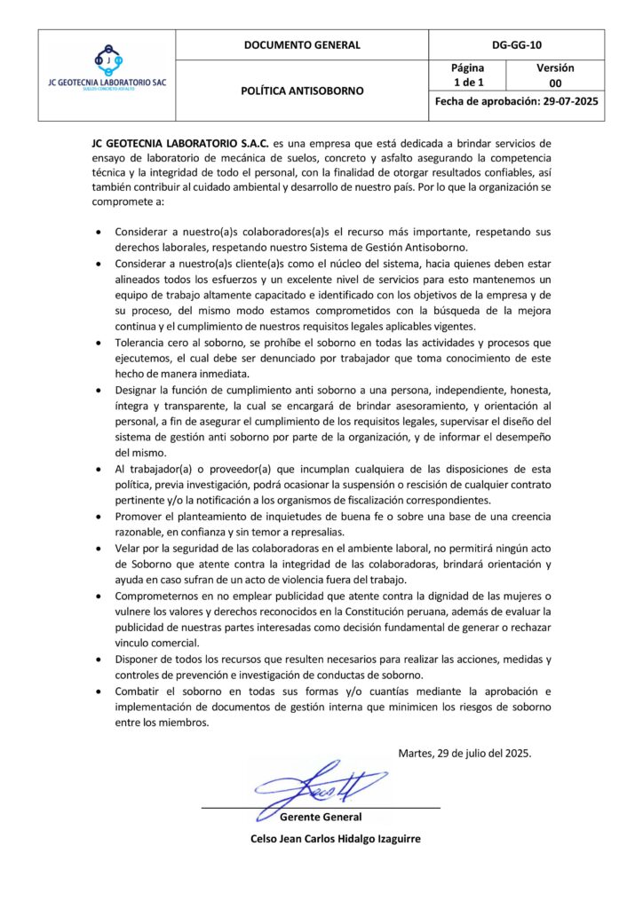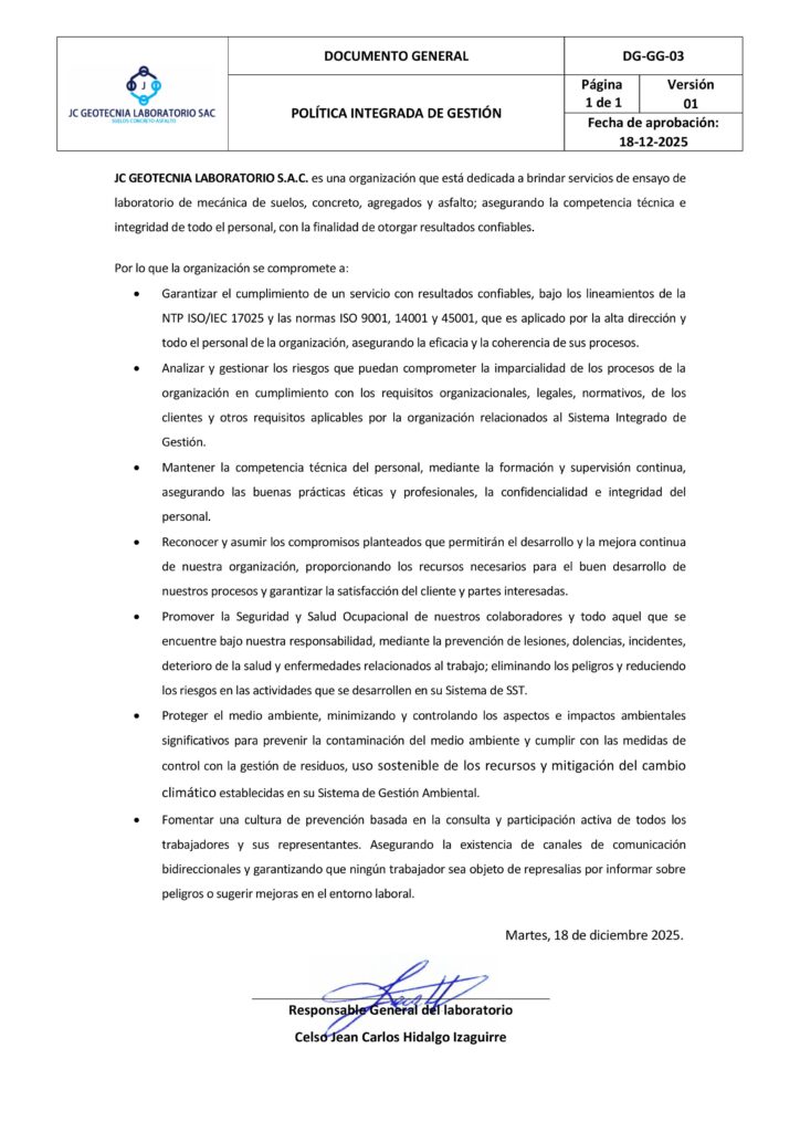 JC GEOTECNIA LABORATORIO S.A.C. actualmente está certificada con la Norma ISO 9001:2015; con el siguiente alcance: